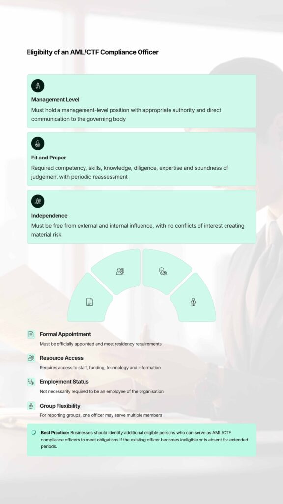 For a reporting group, the AML/CTF compliance officer of one member may also serve as the compliance officer of another member. Where possible, businesses may identify additional eligible person who can be an AML/CTF compliance officer to meet its obligations if the existing compliance officer becomes ineligible or is absent for long periods.
